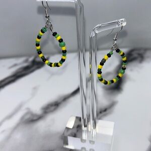 Elevate your style with these vibrant Jamaican beaded hoop earrings. Featuring a striking combination of black, yellow, and green beads, they add a playful touch to any outfit.