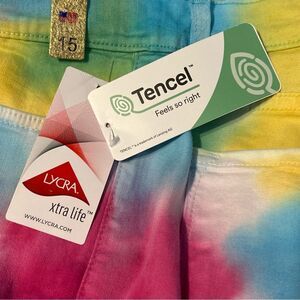 Style tags: high rise super skinny jeggings distressed raw hem tie dye red blue pink yellow festival summer spring Lycra tencel rainbow