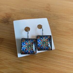 Colorful square earrings with intricate mosaic design. Perfect for adding a pop of color to any outfit.