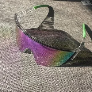 Add a pop of color to your look with these vibrant sunglasses. Featuring a striking purple lens and green accents, these glasses are perfect for making a statement.