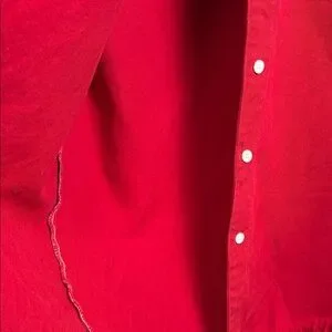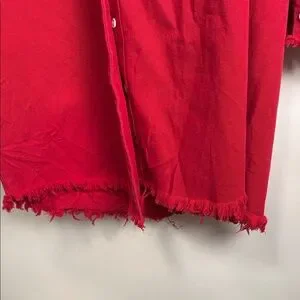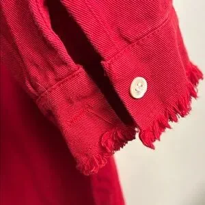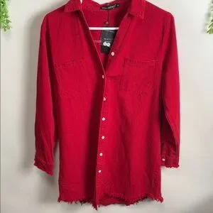 Elevate your style with this vibrant red button-down shirt. Perfect for any occasion with its classic design and comfortable fit. Love the length and ragged fringe detail. Amazing with jeans or leggings and paired with boots. Cotton