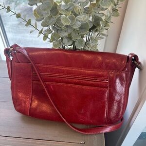 This striking red crossbody bag is crafted from smooth leather, featuring a classic flap-over design and a long adjustable strap for versatile wear. Its medium size and horizontal rectangular shape make it an ideal choice for everyday use, adding a bold touch to any outfit.