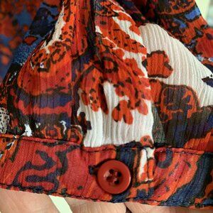 Vibrant red, blue, white and orange women's blouse by Ricki's with tie front, lace detail on back and button cuff. Size 14.