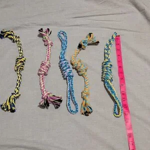 Collection of vibrant rope dog toys. Features pink, blue, purple, orange, and yellow ropes. Ideal for playful pups.