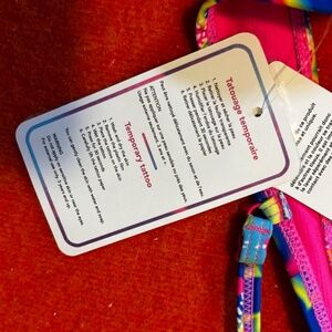 Vibrant abstract flowers underwire balconette bikini swimsuit top new with tags. Underwire from one cup to the other, recycled nylon blend made from reclaimed clothing and other scraps, removable foam padding, adjustable thin straps, chlorine, sunscreen and oil-resistant, quick-dry and 50+ UV protection. It comes with a pack of cute temporary tattoos (retro rollerblades, ice cream and heart). Marked size L, please see pictures for measurements, it fits smaller in my opinion. This item comes from a smoke free, pets friendly home. Recycled bags/box used when possible. Thanks for watching!