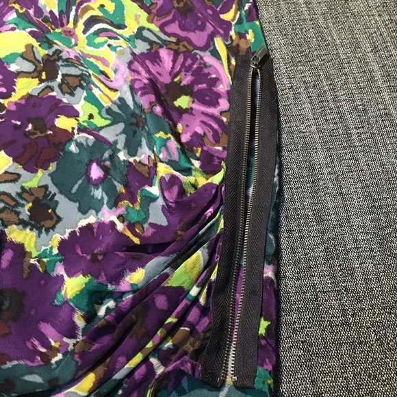 Vibrant and fun silk floral mini dress/tunic with side zipper by BCBG MAXAZRIA in Grape. Size Small. Pull on. Ruched left side at bottom with contrasting black metal zipper. Batman sleeves, approx 3/4 with button closure. A pleated applique on front right in the same fabric as the dress. 100% silk. New, never worn, no tags.