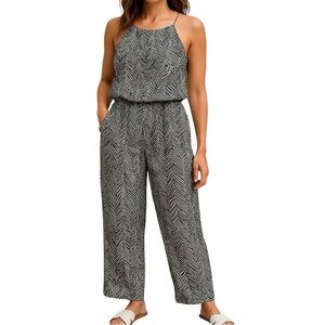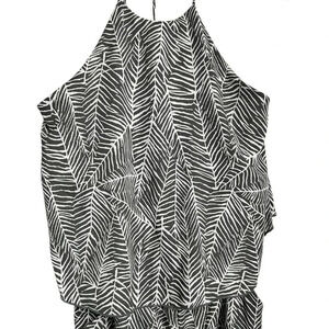 Halter top jumpsuit, Small, gray & white leaf print, with ruffled top & back, elasticized waist, wide legs. Pockets!! Elegant, Summer, Resortwear, Fancy Dinner! New with tags, perfect condition!