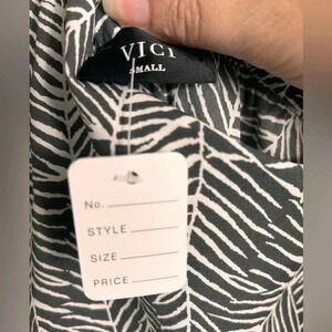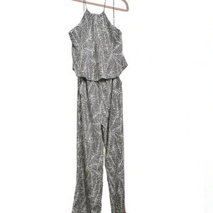 Vici halter top jumpsuit, Small, grey & white leaf print, wide legs, loose fit