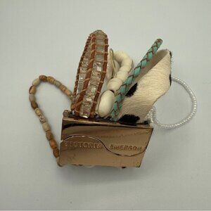 Condition fair to good. There is some wear to the clasp and loss of color on the side as well as a few scratches. There is also a blue mark on the underside of the cow print leather band. Please see photos for close ups to determine your comfort level with this flaw. Clasp works well, strong magnetic closure. Otherwise in nice condition.