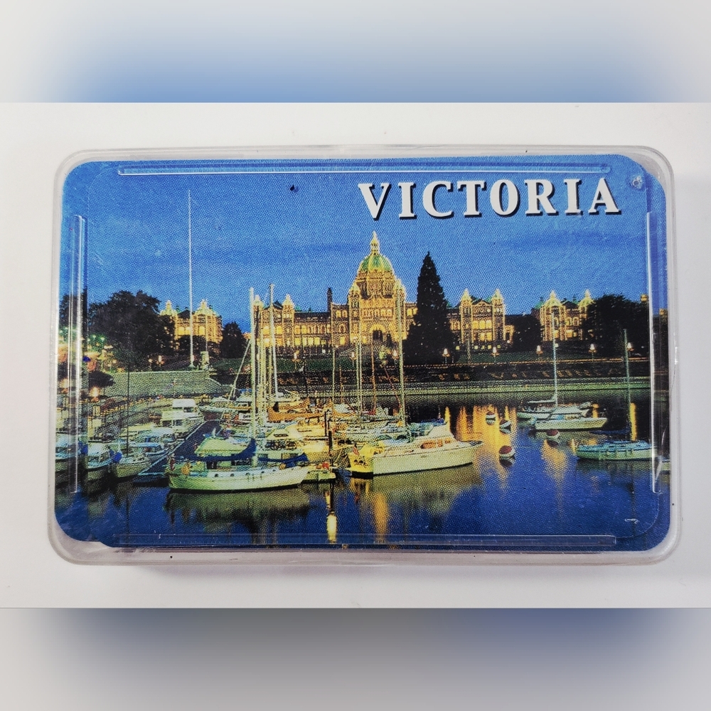 Beautiful Victoria, British Columbia playing cards featuring a scenic view of the harbor and illuminated buildings.
