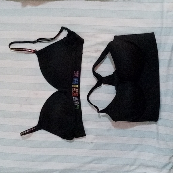 The plain black bra is: Made by Victoria's secret. Size 34D. Original price: $56. COMES WITH TAG