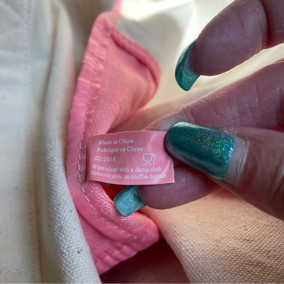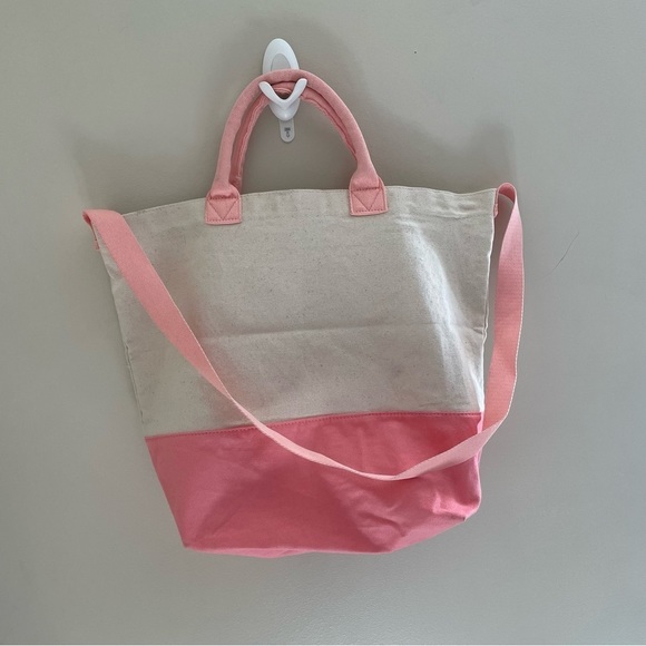 Victoria Secret Beach Tote, Light Pink/Cream/Pink Gold Writing.. canvas like material, has a spot on corner shown in pics, in good condition.. great for vacation/ beach..