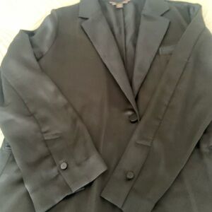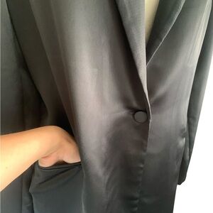 Tags Victorias Secret jacket, black lightweight blazer, minimalist womens outerwear, classic style jacket, black single button coat, XL black jacket, versatile black layering piece, womens casual chic jacket, timeless wardrobe staple, black unlined jacket.