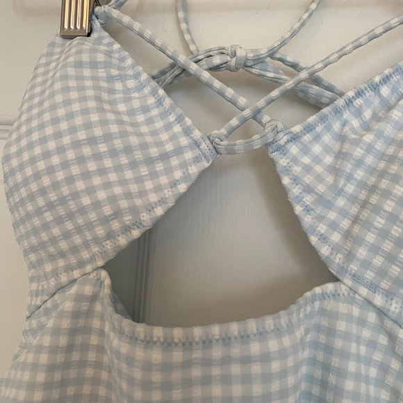 Victoria Secret Swim One Piece White Blue Plaid Checkered Pattern. Lined with removable cups. Core Cutout. Strappy back and clasp buckle at back to secure the suit. Never worn with tags still on.