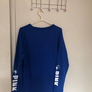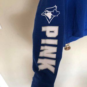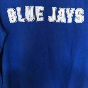 The BLUE JAYS wording at the front is in white sequence and the sleeves have the blue jays symbol! Should fit even if you are larger then a small. Please message me if you have any questions!