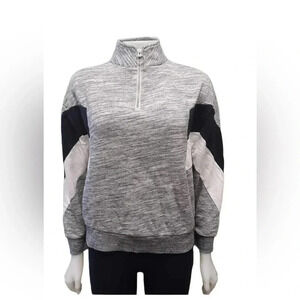 Heather gray with black and white stripes, this 3/4 zip has long sleeves and brand call out on the back of collar. Perfect for chilly weather.