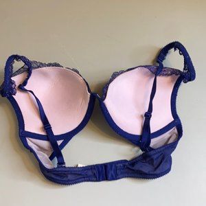 This gorgeous Victoria Secret push up bra features purple lace overlay, padding for push-up , underwire, adjustable straps and band. The back can be turned into racerback/cross cross by moving the straps.
