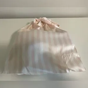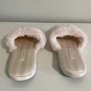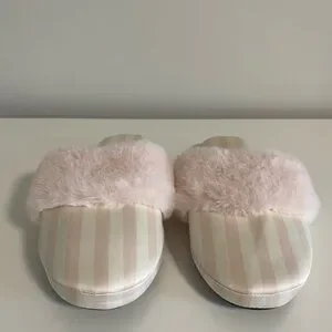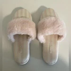 Pink and white striped VS slippers with fur around the top. Slippers come with the bag. Perfect condition. Never worn before.