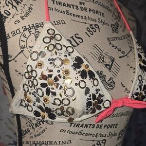 Stylish bikini top with intricate embellishments and pink straps. Perfect for a chic beach look.