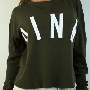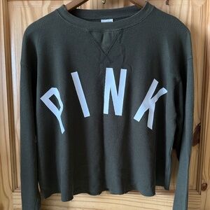 This is an army green waffle crop top. It’s in excellent condition. I couldn’t get the green colour exactly right. It’s labeled an XS. But its and oversized fit.