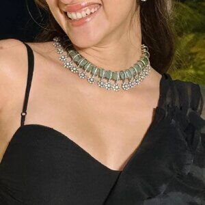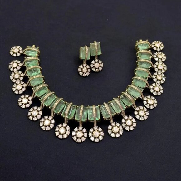 Victorian Golden Polish Emerald Green Ruby Uncut Moissanite Polki Necklace Set