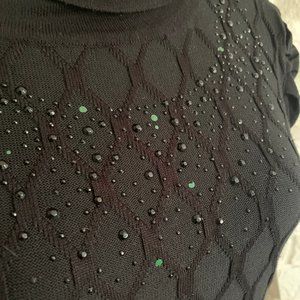 This Victorian-styles tunic top is perfect for any corporate goth to wear to the office or on a night out. This tunic is super stretchy and and comfortable (fits around my 40"+ hips just fine), and the shoulder details and sparkles add some flare. There are a few sparkle studs missing on the front, but is otherwise in great condition.