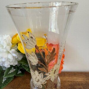 This stunning antique Victorian vase showcases delicate craftsmanship and floral elegance. Made from clear blown glass, it features hand-painted white daisies and brown-gold foliage with enameled accents. The body flares from a round base to a fluted rim, creating an elegant silhouette perfect for display.