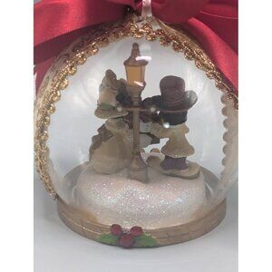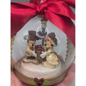 Scene showcases Mickey & Minnie holding a holiday present in front of a light stand.