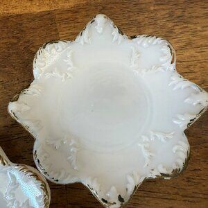 Victorian Milk Glass Trinket Dishes Hand Painted Floral Embossed Leaf Motif