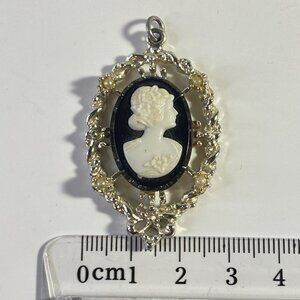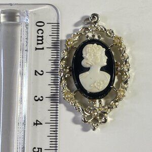 Keywords: vintage cameo pendant, Victorian style jewelry, faux pearl pendant, black and white cameo necklace, ornate costume jewelry, collectible cameo charm, elegant gift for her, stocking stuffer, birthday gift, classic vintage accessory, retro jewelry, holiday gift, timeless style cameo, bridesmaid jewelry, heirloom style pendant, antique-inspired necklace