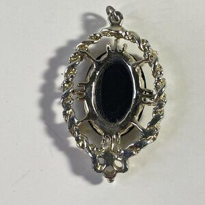 This vintage cameo pendant features a white carved profile against a black oval background, framed by an ornate gold-tone filigree border set with small faux pearls. Measuring just under 4 cm long, it is a versatile piece that can be worn on a chain as a necklace or added to a charm collection. The design reflects a timeless Victorian-inspired style, perfect for elegant or vintage-inspired outfits. Light surface wear consistent with age, overall in very good condition.