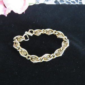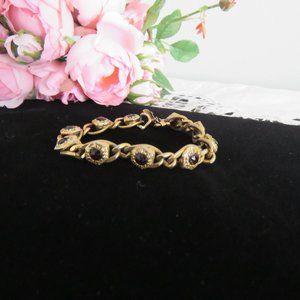 A very pretty Victorian revival styled bracelet from the 1950s. Made and signed by Goldette NY who was known for their Victorian styled jewelry. This bracelet features garnet colored rose cut rhinestones set in amongst the gold links. A very pretty piece of vintage jewelry. There is some wear of the gold, mostly on the underside of the bracelet. The piece measure 7.5" long.