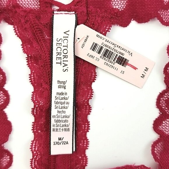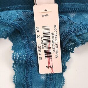 New with tags, Victoria's Secret 2 pairs thong string panties in a soft stretch floral lace, one in pinkish red and the other blue, size Medium.