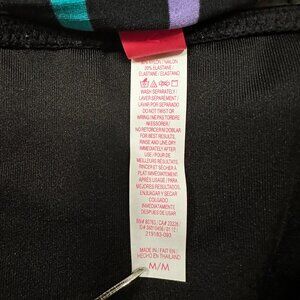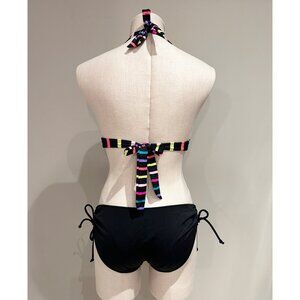 • Black and multicolored striped bathing suit top with solid black bottoms