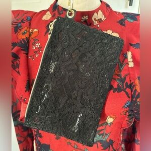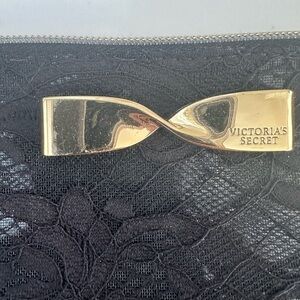 Victoria’s Secret Black Floral Lace Small Clutch 8” X 5” Plastic Lined Gold Bow