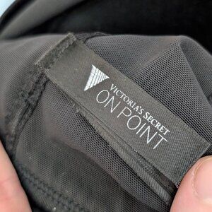 This sports bra by Victoria's Secret is made of a polyester/elastane blend (85/15) with cup linings made of 100% polyester. The bra is black with adjustable straps, a padded (and somewhat defined) bust, a criss-cross strap back, and elastic throughout. I love the look of this piece but have only worn it a few times. As it turns out, if the cup size is too big, it will bulge weirdly in your underarms. There is normal wear, but no issues affecting wearability (except size).
