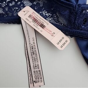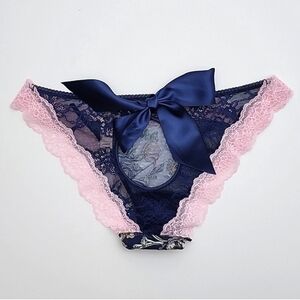 New with tags, Victoria's Secret Dream Angels Cheekini Tanga bottom in navy blue sheer panty with a sexy peekaboo back and bow, a light pink trim and detailed floral lace pattern, size large.