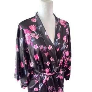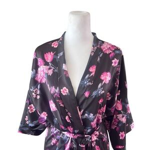 Victoria’s Secret Elegant black kimono robe with vibrant pink floral patterns. Perfect for a touch of luxury in your loungewear collection.