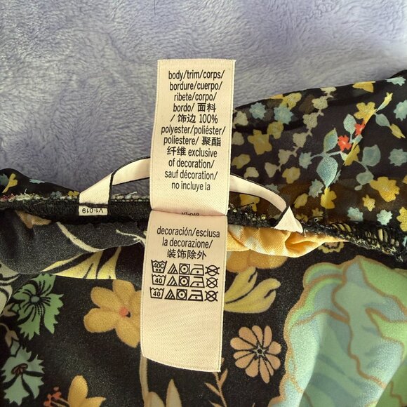 This is a floral black satin romper from Victoria's Secret, size XS. For the fabric content, please see the photos. The straps are adjustable, as well as the tie at the waist. It's also super soft and flowy with no pulls or damage!