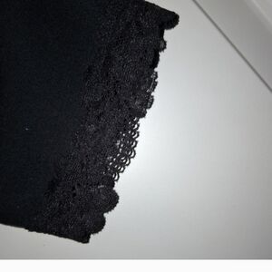 Elegant black wrap dress with lace trim. Perfect for any occasion.
