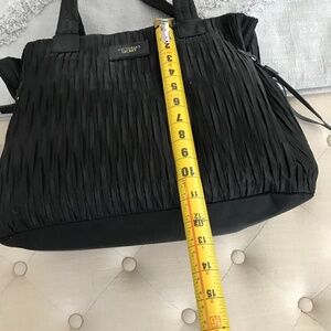 Large tote in black textured material by Victoria’s Secret. Excellent condition, used a handful of times. Double handles for over the shoulder or arm carry. Zippered Top. One interior zipper compartment. Can wear open or can cinch in the sides for a more compact look (similar to the LV Neverfull). Perfect for toting around all your essentials. Perfect travel bag. Very versatile, classic tote. Can be dressed up for business or used as a beach tote. See pics for measurements in inches. Smoke free home.