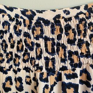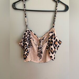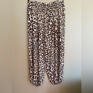 Stylish leopard print pajama set. Features a cropped top and relaxed pants. Perfect for lounging.