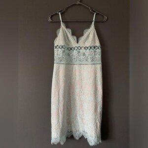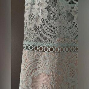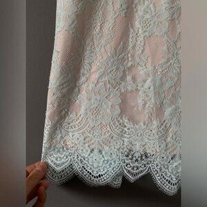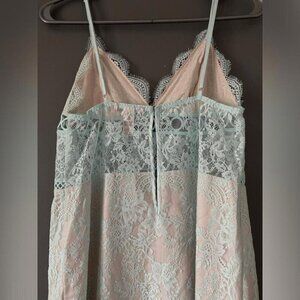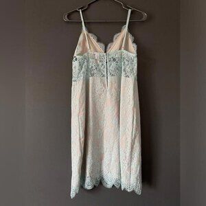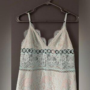 Dreamy Victoria's Secret lace slip dress in soft mint green with a blush lining. Features a flattering keyhole cutout waist and intricate scalloped floral lace, perfect for the Coquette or Ethereal aesthetic.
