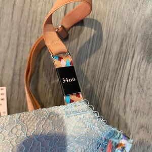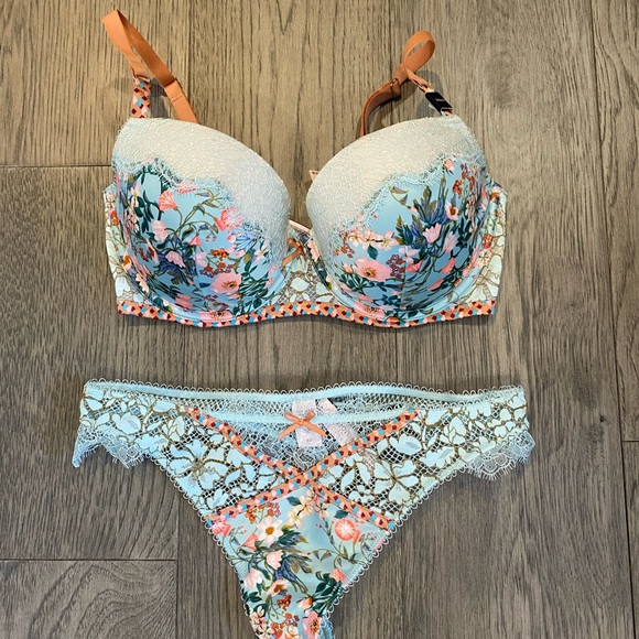NWT 34DD (sister size to 32DDD) Elegant lace and satin bra with adjustable straps. Features a blend of pastel hues. Dream Angels collection, Demi cup. Matching panty available in size small. Bundle and save!