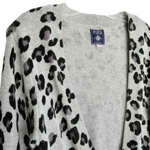 This versatile, longer-length boyfriend cardigan features a chic black and dark grey leopard print on a soft light grey background.