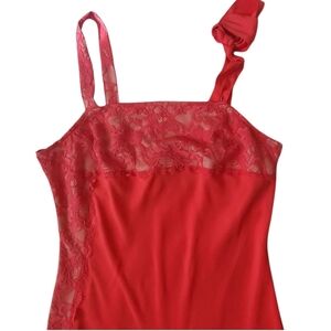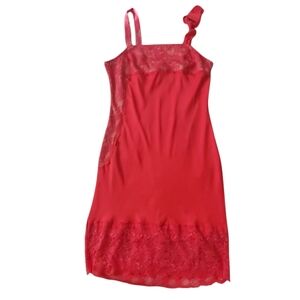 This elegant red lace slip dress is perfect for a romantic evening. The delicate lace detailing adds a touch of sophistication. Ideal for women who appreciate style and comfort.