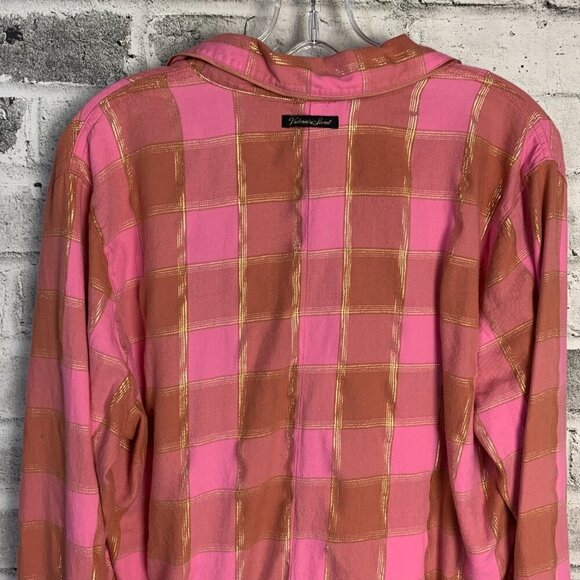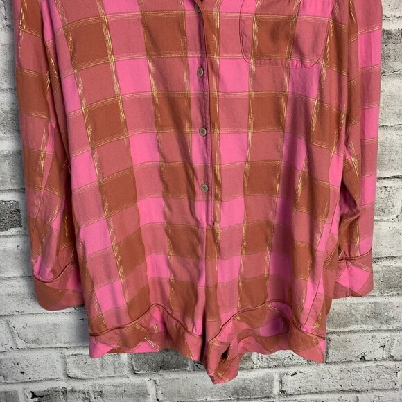 Victoria's Secret pink gold plaid soft flannel relaxed fit long sleeve button up collar short romper loungewear pj's. Please reference pictures for missing waist belt