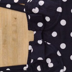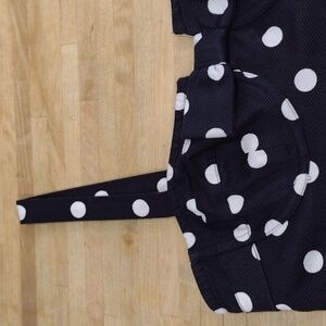 Bra cup bodice with bow in the middle, faux hook and eye back, side zip. Super cute and on trend right now with the polka dots. I’d pair it with huge sunglasses and a silk head scarf for that dolce vita Sophia Loren look, but I mean you could also add some oversized yellow pumps and go for Minnie Mouse haha. Fits like a standard size small if you want a classy not trashy fit.