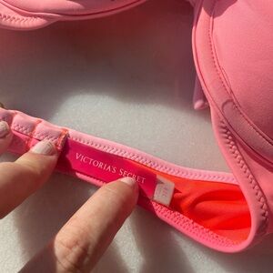 Pink Victoria's Secret bathing suit top. Size 32B. Good used condition, color has worn out a bit and a bit of minor pilling on the front but still has a lot of life in it.