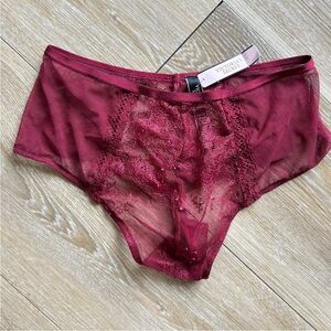 Gorgeous brand-new Victoria's Secret lace set in a rich burgundy/wine color. Sheer mesh with floral lace detailing. Bra has adjustable straps and back hook-and-eye closure. Matching thong is a high-rise cut, brand new with tags. Never worn.
